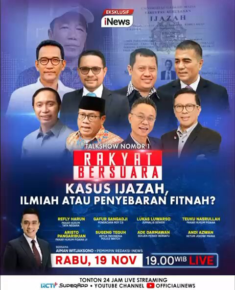Selengkapnya dapat Anda ikuti dalam program spesial Rakyat Bersuara dengan tema: KASUS iJAZAH, iLMiAH ATAU PENYEBARAN FiTNAH yang dipandu Aiman Witjaksono.