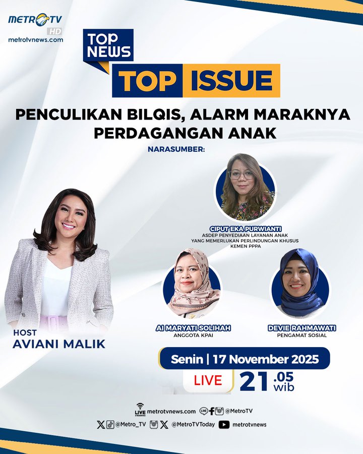 Saksikan TOP iSSUE dengan tema "KiSAH BiLQiS, ALARM MARAKNYA PERDAGANGAN ANAK" bersama host Aviani Malik, Edisi Senin, 17 November 2025 (27 Jumadil Awal 1447 Hijriyah), pukul 21.05 WiB hanya di Metro TV